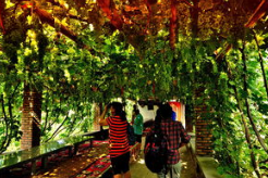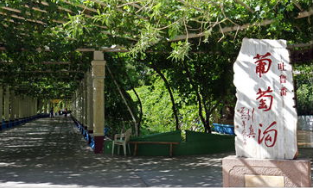 火洲闻名遐迩的清凉世界”-----葡萄沟,位于吐鲁番市东北13千米火焰山峡谷中。该沟是一条不太深的切蚀沟,南北长8千米,东西宽约0.5千米,最宽处可达2千米,一条小溪流贯其间,沟侧沿隙中时有汩汩泉水渗出。沟中绿荫蔽日,满沟全是层层叠叠的葡萄架,花果树木点缀其间,村舍农家错落有致,山坡高处还有许多空心土垒砌成的专门晾晒葡萄干的晾房葡萄沟现有葡萄400公顷,主要种植著名的无核白葡萄、马奶子、喀什哈尔、黑葡萄、比夹干、梭梭葡萄、紫葡萄等数十个葡萄品种。年产鲜葡萄600万千克,葡萄干300多吨。这里的无核白葡萄干鲜绿晶亮,酸甜可口,在国际市场上享有很高的声誉,被称做中国绿珍珠。设在葡萄沟与吐鲁番市间的果酒厂,引进了国内一流的葡萄酒酿造、贮存、灌装的生产流水线和葡萄、哈密瓜、桑椹罐头和浓缩汁软包装生产流水线,及一个可容纳数千吨瓜果的大型冷藏库。这里生产的吐鲁番全汁葡萄酒畅销全国。在葡萄沟深处,专为中外旅游者修建了一处占地数千平方米的葡萄游乐园,这里浓荫蔽日,铺绿叠翠,泉流溪涌,曲径通幽,甜蜜的葡萄,醉人的歌舞,令人心旷神怡。