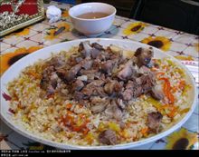 1、将羊肉切成大块和羊棒骨加水放进高压锅煮熟,锅中可放一块姜去腥,不要加盐; 2、大米洗净,加入羊汤放入电饭煲蒸煮,撇一些羊油和饭一起煮,汤量比平时煮饭时放的水略少,因为之后还要再焖一次; 3、将羊肉捞出切丁,胡萝卜切成细丁,葡萄干洗净泡一下,喜欢吃洋葱的将洋葱切成丁备用; 4、饭煮熟后将3中各种配料及盐、糖、黑胡椒适量加入电饭煲和饭混合均匀,加适量羊汤,再焖一次; 5、焖好后翻匀,就可装盘了,吃的时候配一些水果可解腻。[1] 营养价值 羊肉(瘦):羊肉肉质细嫩,容易消化,高蛋白、低脂肪、含磷脂多,较猪肉和牛肉的脂肪含量都要少,胆固醇含量少,是冬季防寒温补的美味之一;羊肉性温味甘,既可食补,又可食疗,为优良的强壮祛疾食品,有益气补虚,温中暖下,补肾壮阳,生肌健力,抵御风寒之功效。 稻米:大米具有很高营养功效,是补充营养素的基础食物;大米可提供丰富B族维生素;大米具有有补中益气、健脾养胃、益精强志、和五脏、通血脉、聪耳明目、止烦、止渴、止泻的功效。 洋葱:洋葱是老百姓餐桌上最常见的食物,无论中餐还是西餐,洋葱使用都非常普遍,洋葱的营养及其丰富,特别是它的特殊功效更是成为食物原料中的佼佼者。洋葱具有发散风寒、抵御流感、强效杀菌、增进食欲、促进消化、扩张血管、降血压、预防血栓、降低血糖、防癌抗癌、清除自由基、防治骨质疏松症和感冒;并且还可治疗消化不良、食欲不振、食积内停等症。